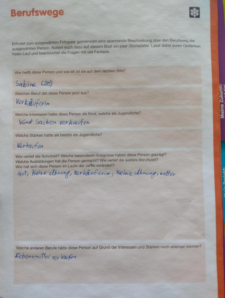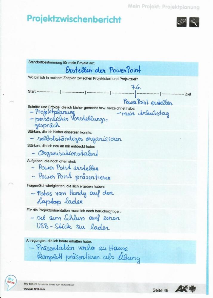 Die "My future"-Mappe, Schritt für Schritt zum Wunschberuf, wird uns jährlich in Jahrgangsstärke von der Arbeiterkammer Tirol kostenlos zur Verfügung gestellt. Diese Mappe ist in vier Register gegliedert, enthält Arbeitsblätter mit vielfältigen Methoden zur Berufsorientierung, kreative Übungen, Rechercheaufträge, Interviewleitfäden und Raum für die eigene individuelle Portfolioarbeit.